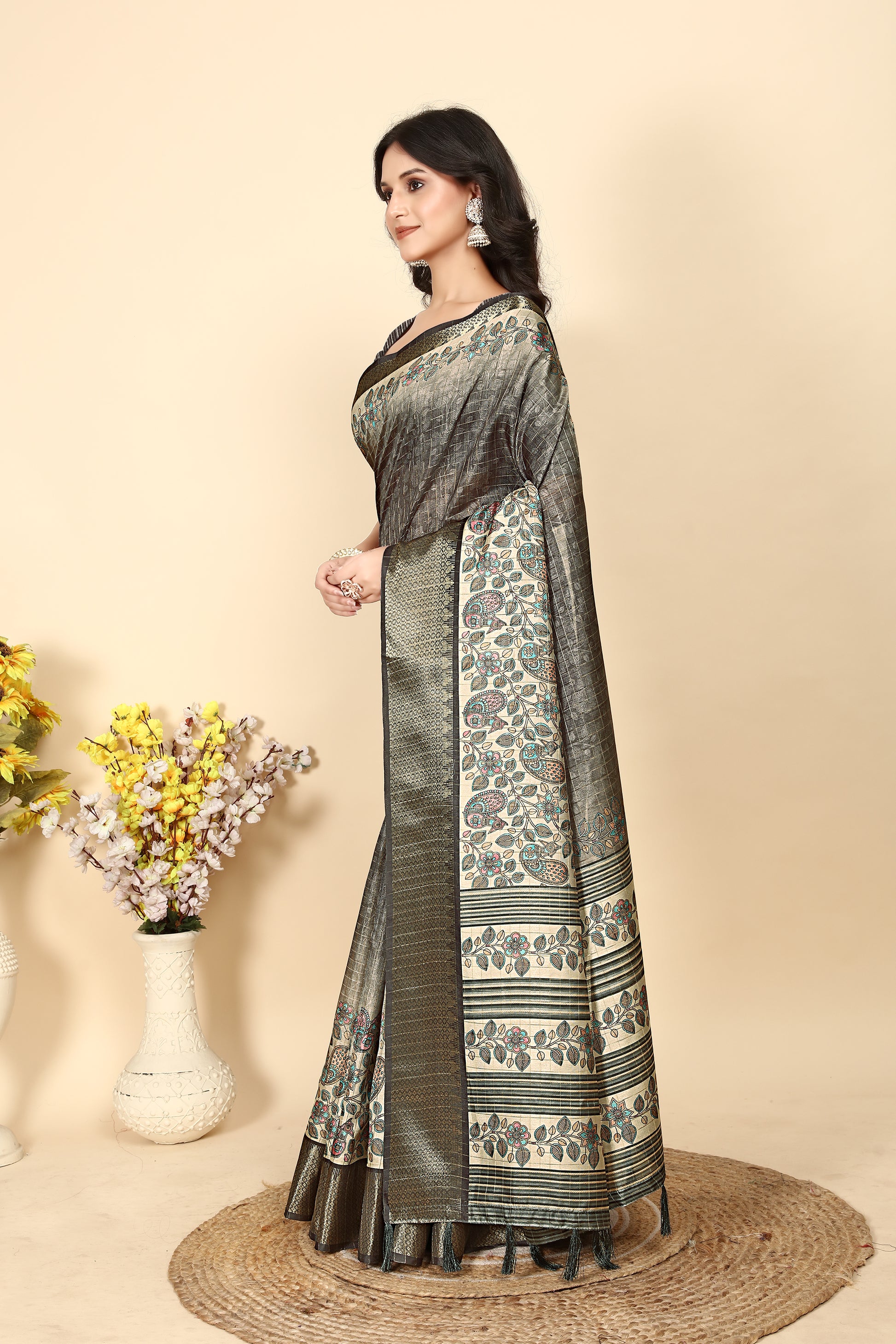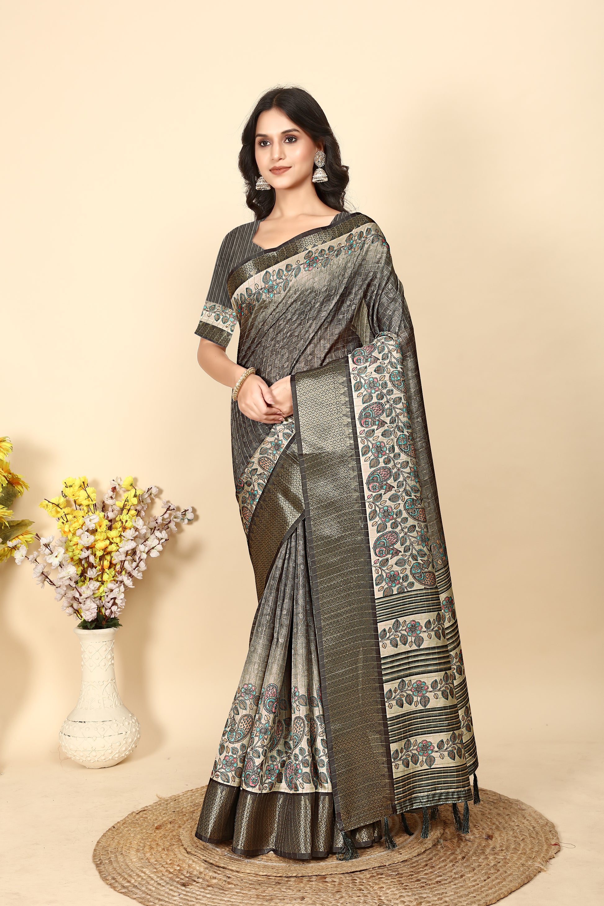 J6 Designers Soft Dola Silk Chex Printed Jacquard border Saree With Blouse - Picok